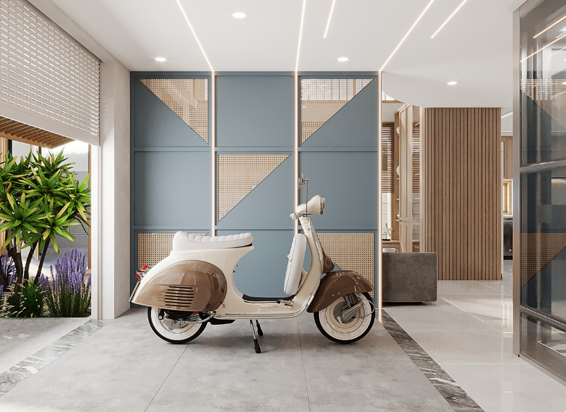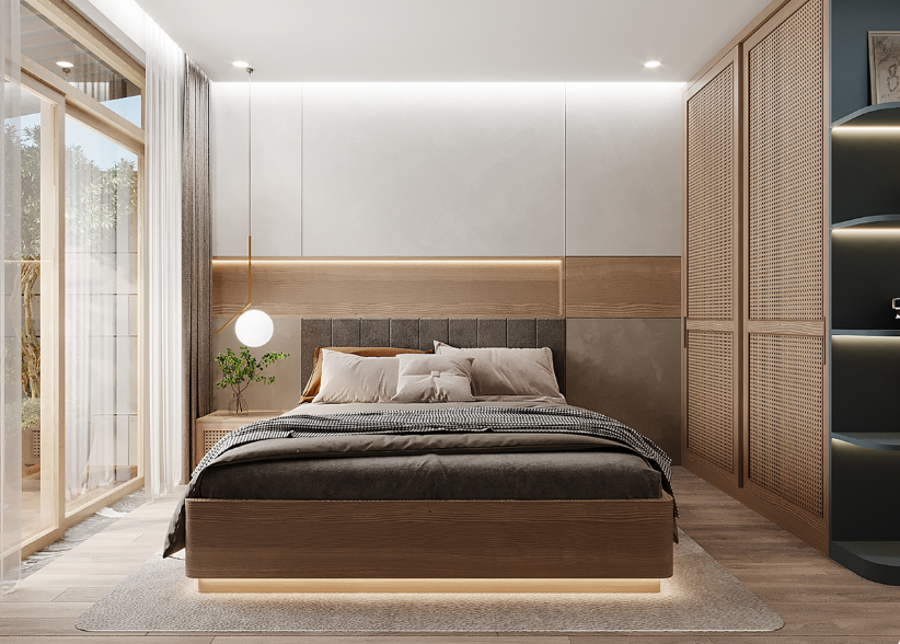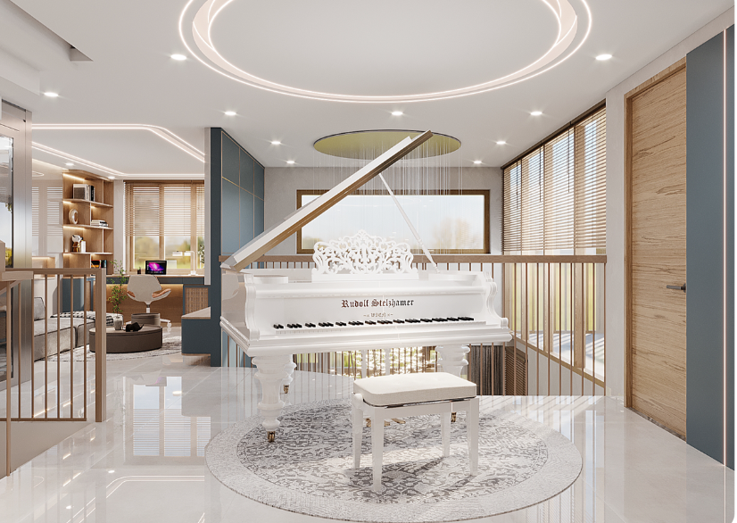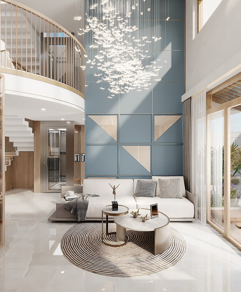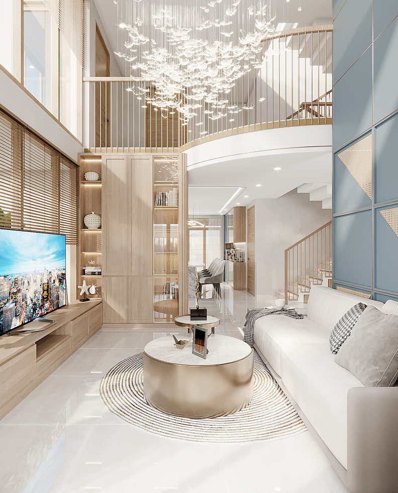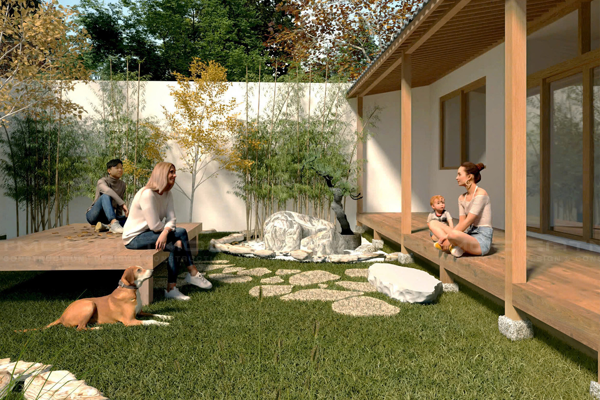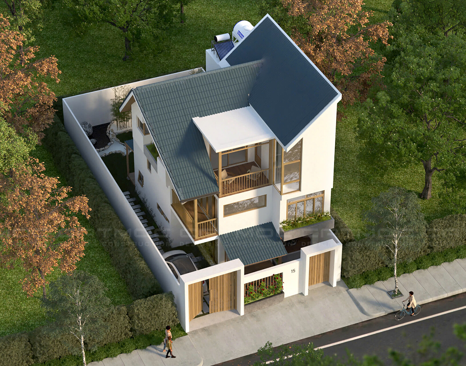 Mang phong cách Nhật Bản_nhẹ nhàn. Với đường nét gãy gọn, hình khối mạnh mẽ nhưng vẫn tạo cảm giác ấm áp nhờ gam màu trắng tinh tế kết hợp cùng gỗ tự nhiên. Mái dốc cao vừa tạo điểm nhấn kiến trúc vừa giúp thông thoáng, chống nóng hiệu quả. Các ô cửa kính lớn mở rộng tầm nhìn, đón sáng và gió trời, kết nối không gian trong – ngoài. Nội thất bên trong tối giản mà sang trọng, nổi bật với giếng trời và hệ đèn treo nghệ thuật, tạo nên hiệu ứng thị giác độc đáo. Đây là một thiết kế vừa hiện đại, vừa gần gũi thiên nhiên.