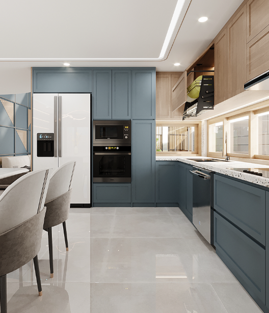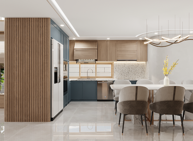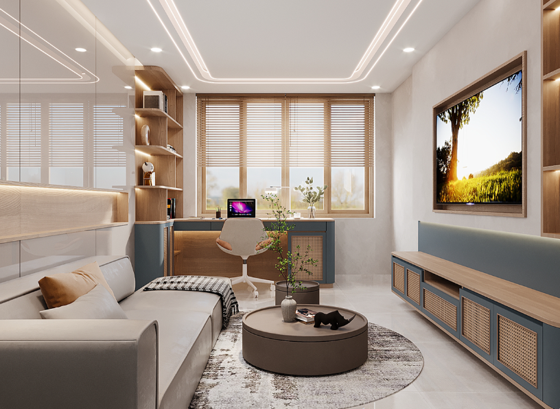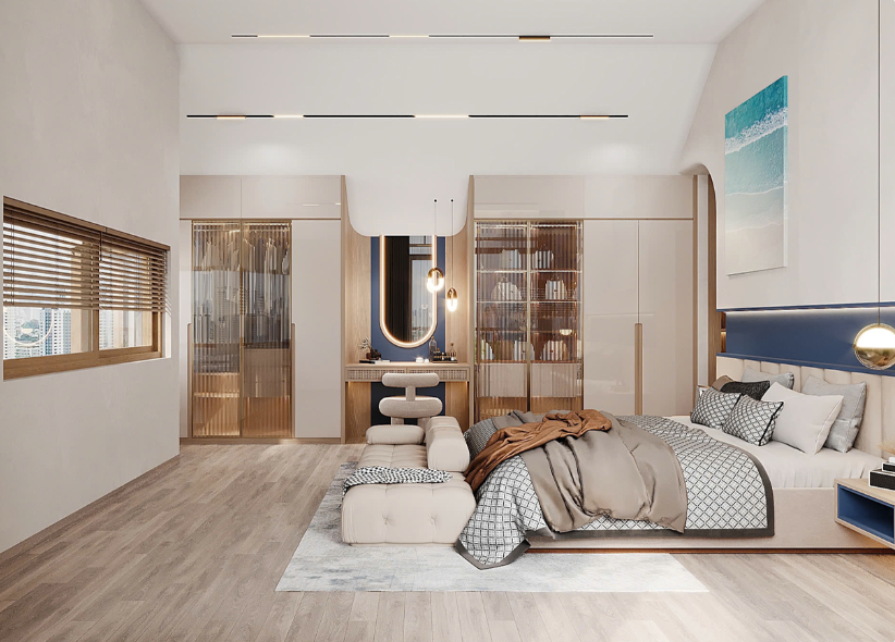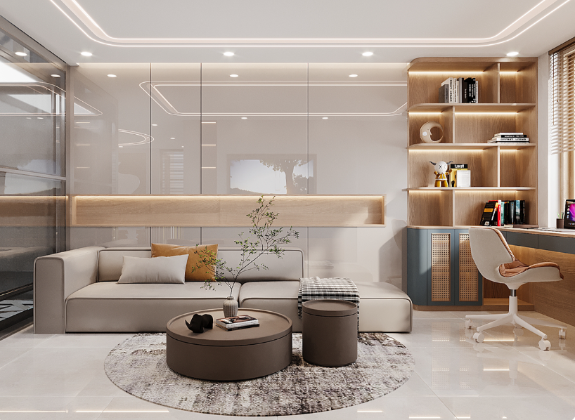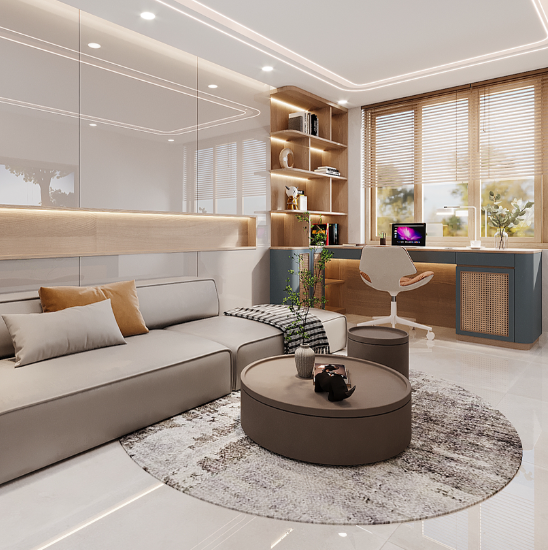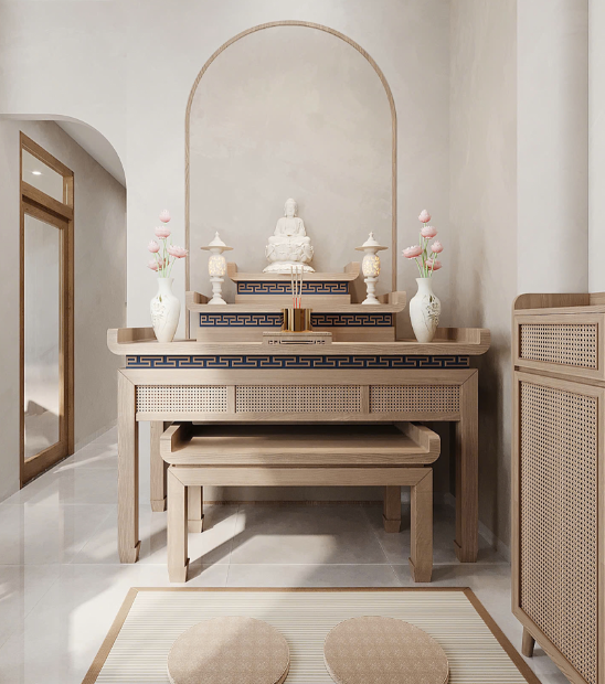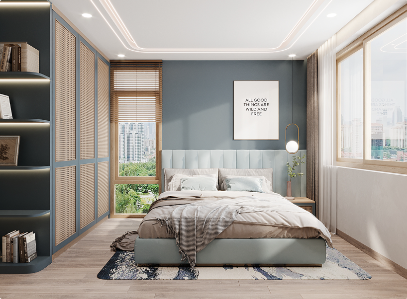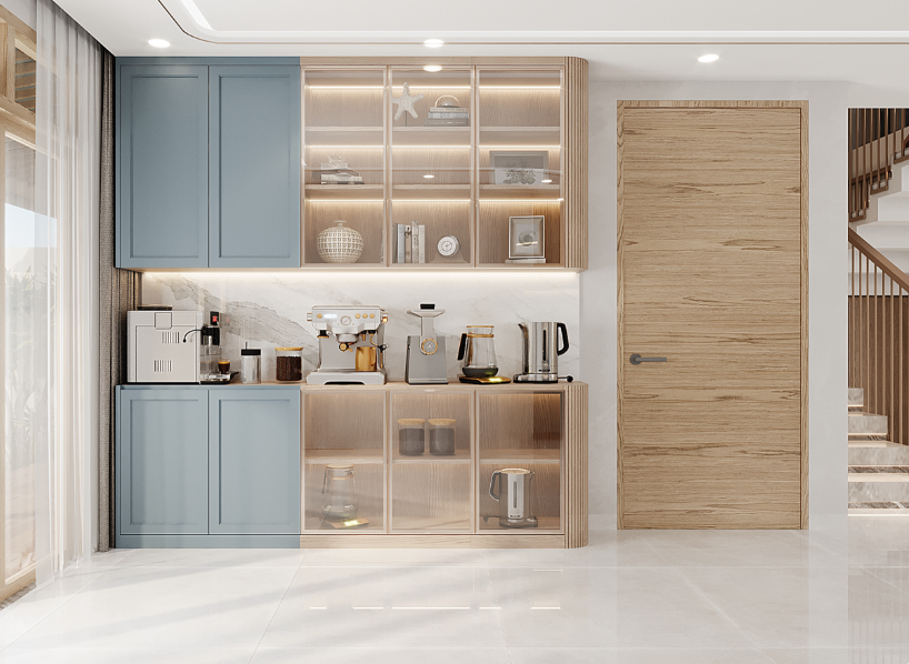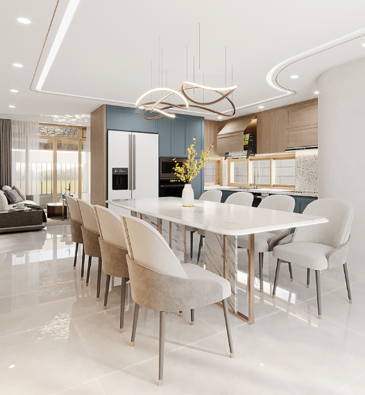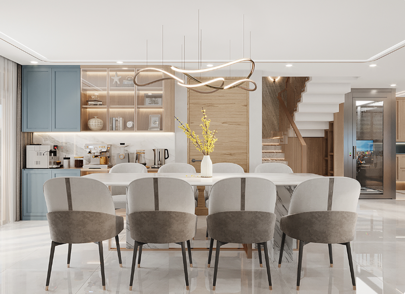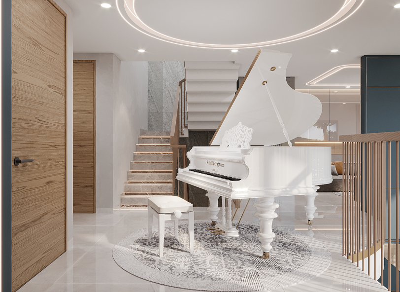 Mang phong cách Nhật Bản_nhẹ nhàn. Với đường nét gãy gọn, hình khối mạnh mẽ nhưng vẫn tạo cảm giác ấm áp nhờ gam màu trắng tinh tế kết hợp cùng gỗ tự nhiên. Mái dốc cao vừa tạo điểm nhấn kiến trúc vừa giúp thông thoáng, chống nóng hiệu quả. Các ô cửa kính lớn mở rộng tầm nhìn, đón sáng và gió trời, kết nối không gian trong – ngoài. Nội thất bên trong tối giản mà sang trọng, nổi bật với giếng trời và hệ đèn treo nghệ thuật, tạo nên hiệu ứng thị giác độc đáo. Đây là một thiết kế vừa hiện đại, vừa gần gũi thiên nhiên.